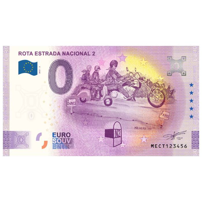 Data de emissão: 25 de setembro 2021. A nota ROTA ESTRADA NACIONAL 2 2021-2 é um exclusivo NumisVilaReal e conta com diversos parceiros ao longo da estrada para que possa chegar a todos e tornar uma das viagens mais inesquecíveis, ainda mais memorável. O desenho desta nota conta com uma aguarela original do nosso Manuel Teixeira, de Amarante, que homenageia todos aqueles que percorrem Portugal de norte a sul. Nesta curiosidade encontramos a hábil mão de Manuel Teixeira que não só assina o desenho original, como também pintou 15 notas (números 85-99) e assina o seu trabalho.