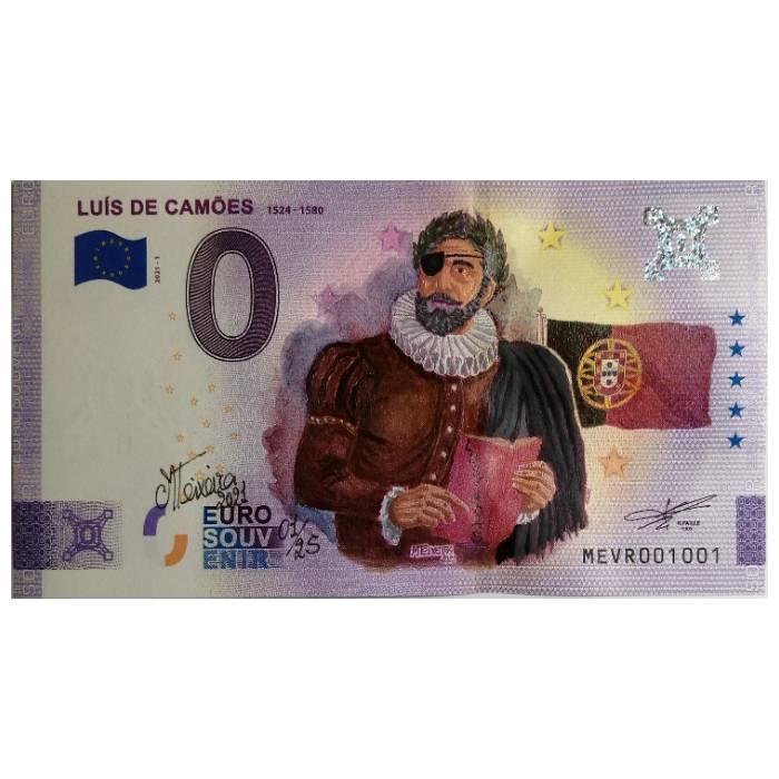 O desenho original deste Euro Souvenir é da autoria de Manuel Teixeira, um talentoso artista plástico de Amarante que colabora com a NumisVilaReal desde 2020, e que pintou 25 notas, conforme a aguarela original, e assinou-as. O Príncipe dos Poetas surge-nos em todo o seu esplendor.