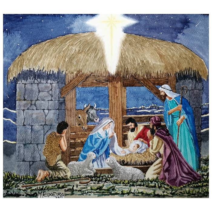 A aguarela de Manuel Teixeira apresenta a imagem do Presépio baseada numa impressão tridimensional da infância de Filipe Cunha.